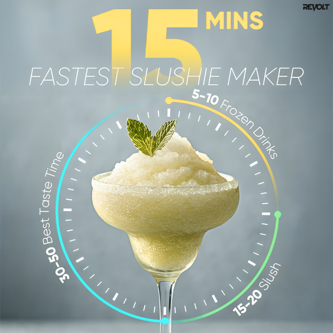 Virtually no time at all. The REVOLT IceCrafter™ is designed for instant enjoyment — simply plug it in, add your ingredients, and start crafting delicious frozen drinks within minutes. No ice, no prep, no hassle.