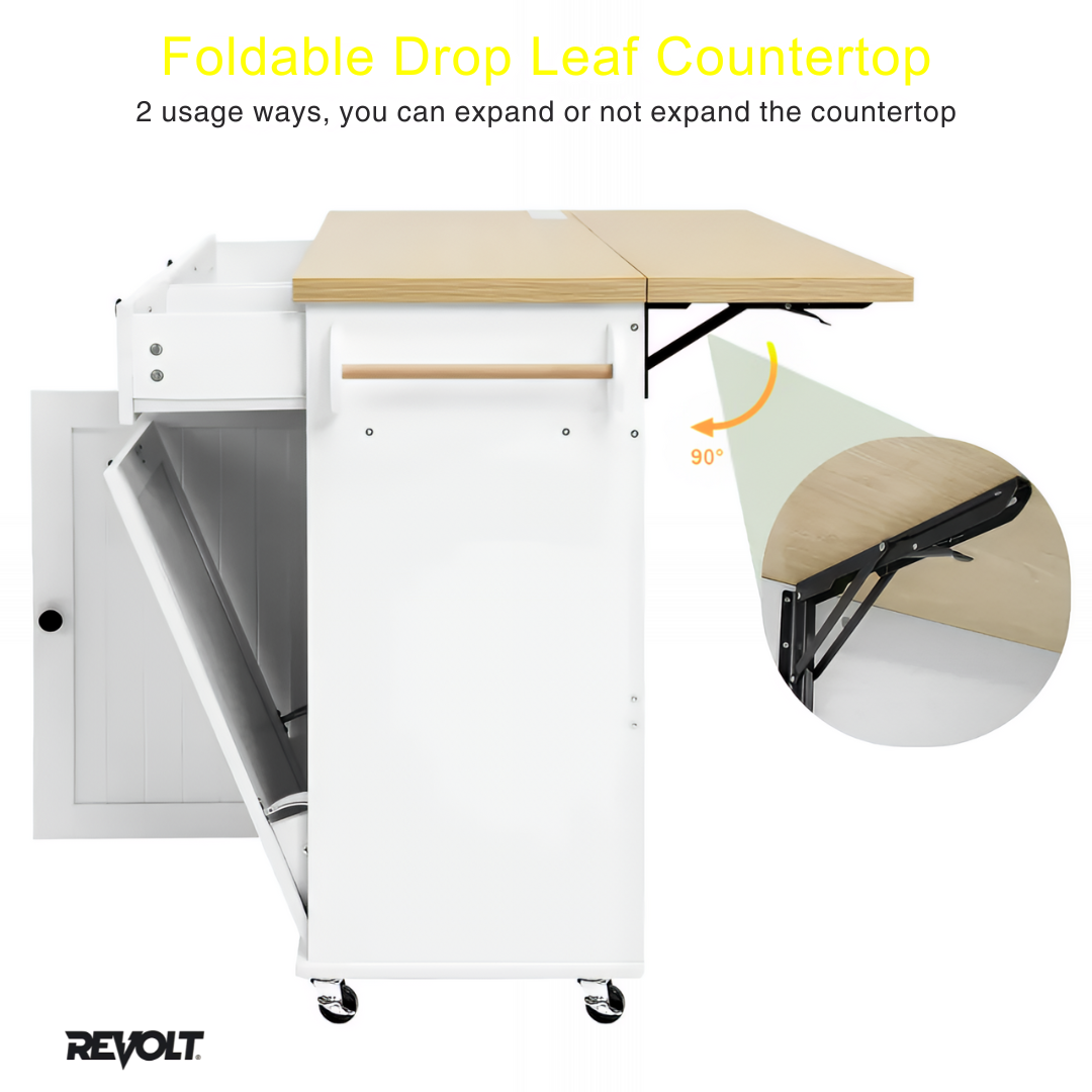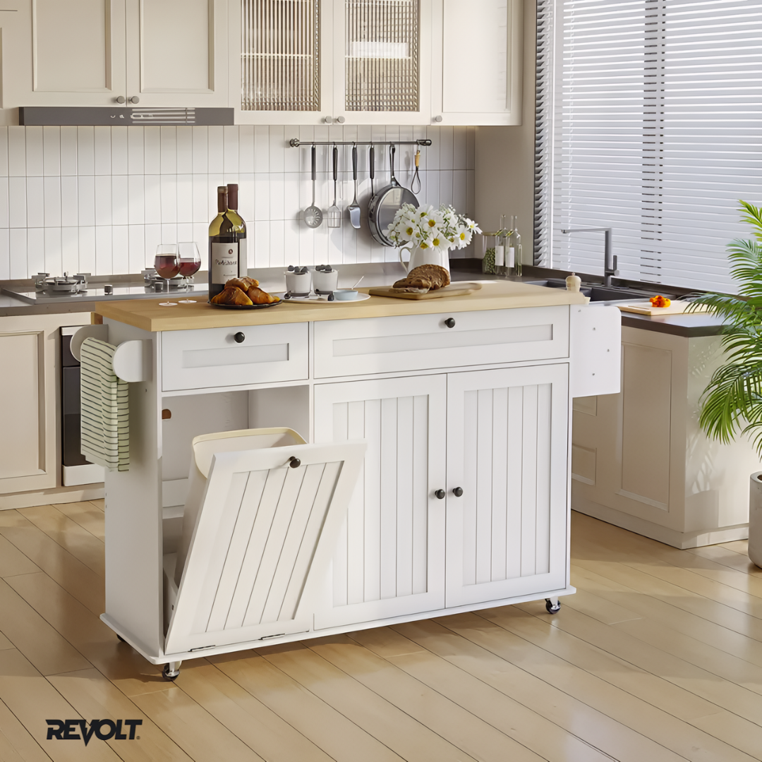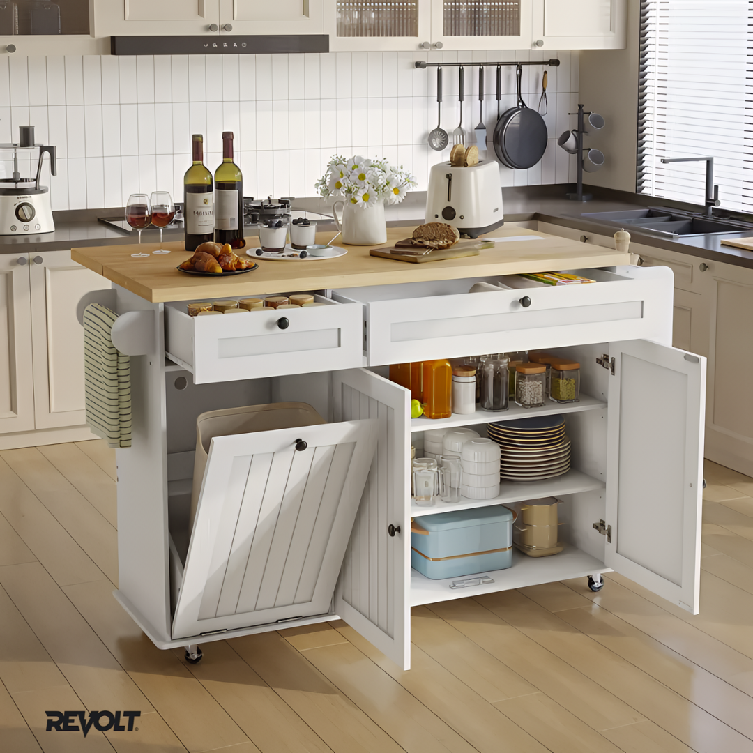 The REVOLT Nexus™ combines modern craftsmanship with intelligent design — featuring a power outlet for appliances, a drop-leaf for extended workspace, integrated spice and knife racks, and a hidden trash cabinet. It’s the ultimate all-in-one kitchen solution.