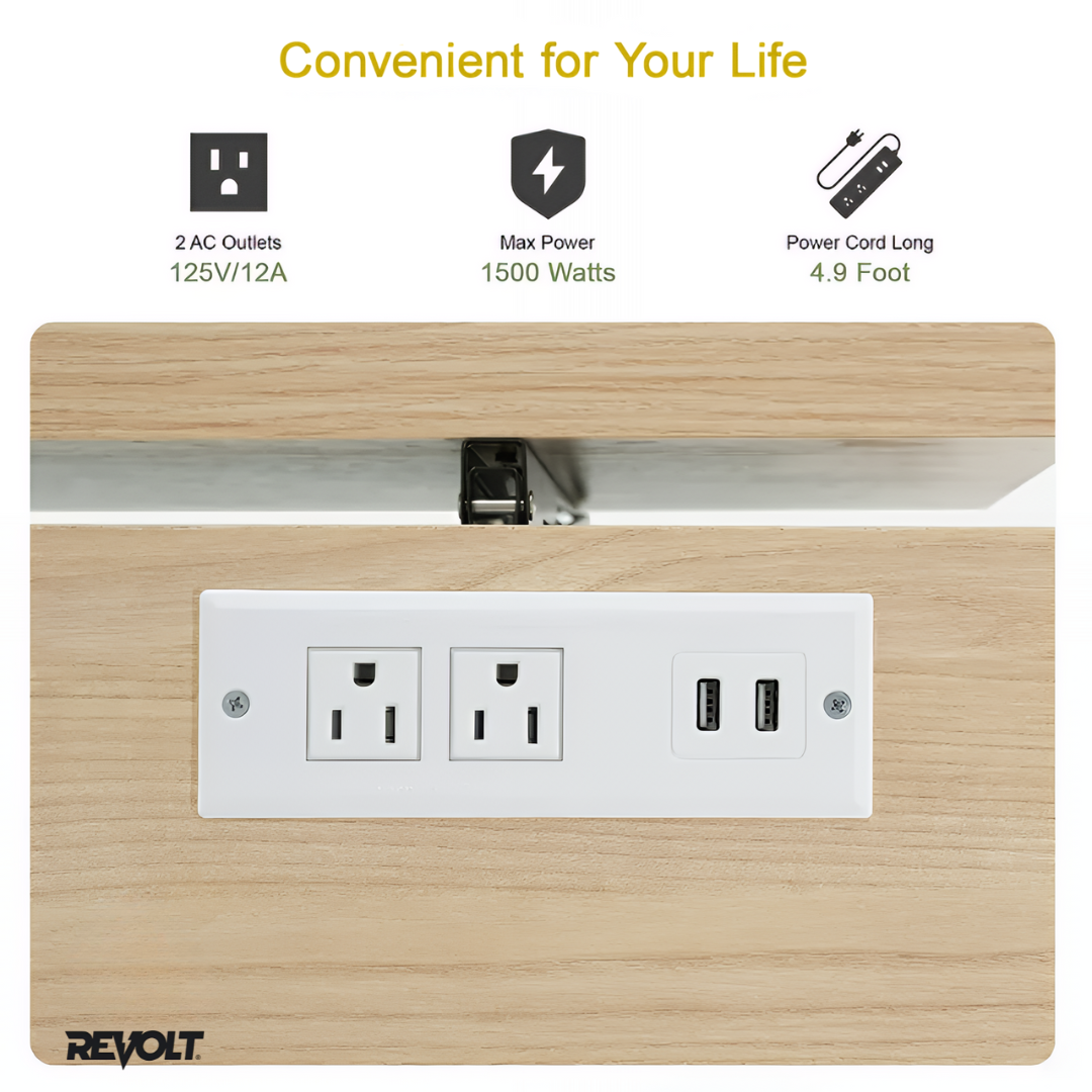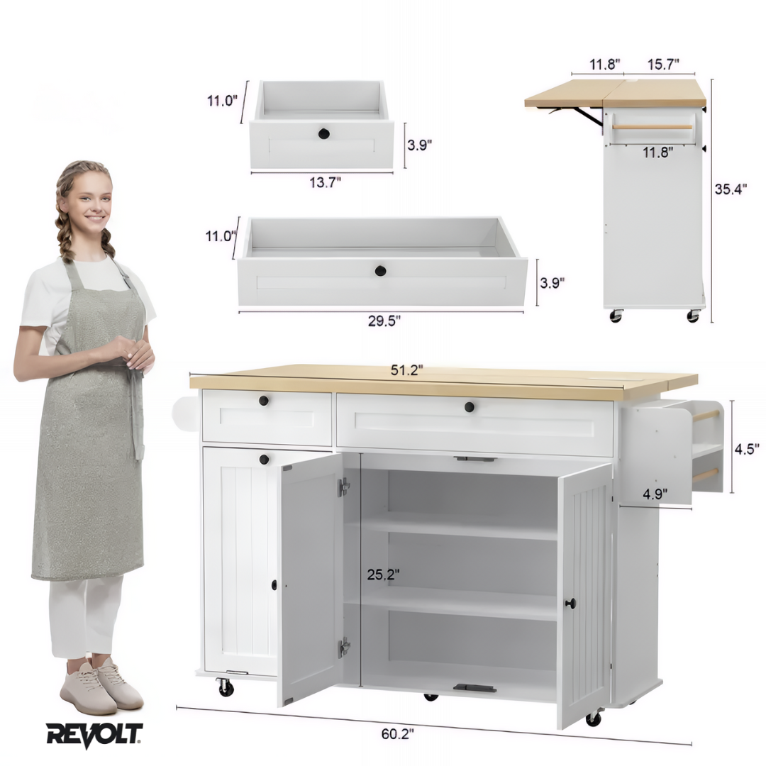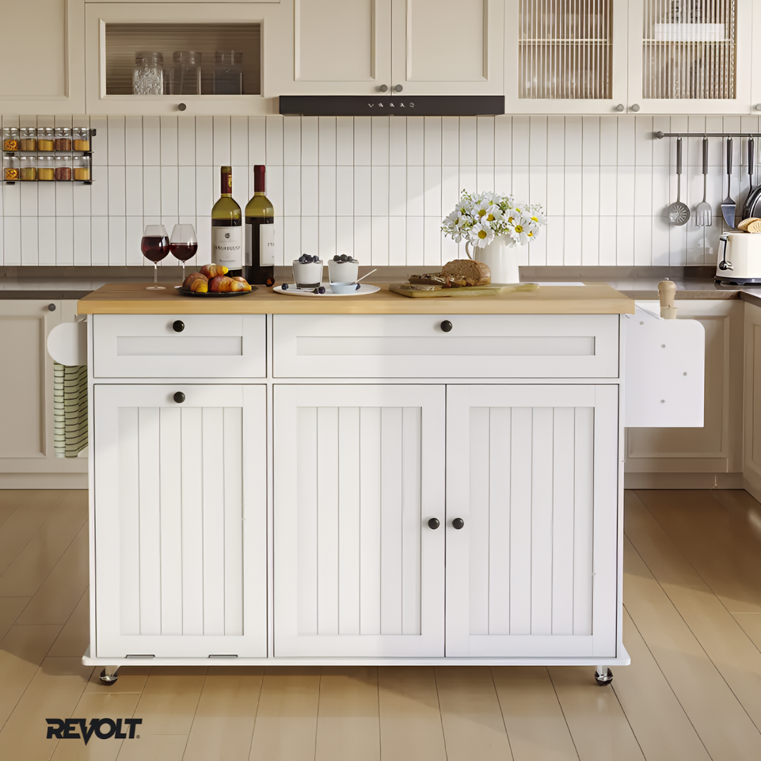 The REVOLT Nexus™ combines modern craftsmanship with intelligent design — featuring a power outlet for appliances, a drop-leaf for extended workspace, integrated spice and knife racks, and a hidden trash cabinet. It’s the ultimate all-in-one kitchen solution.
