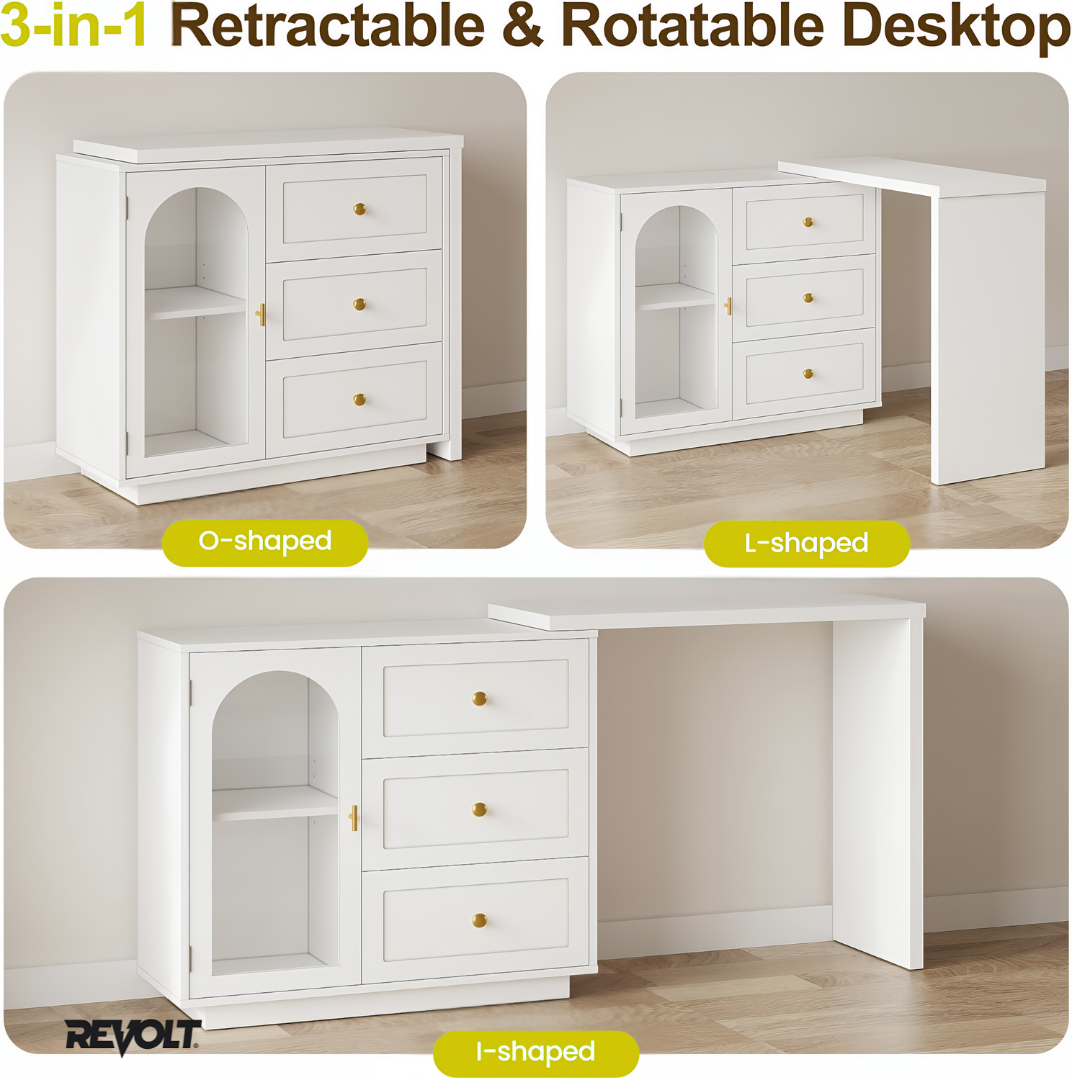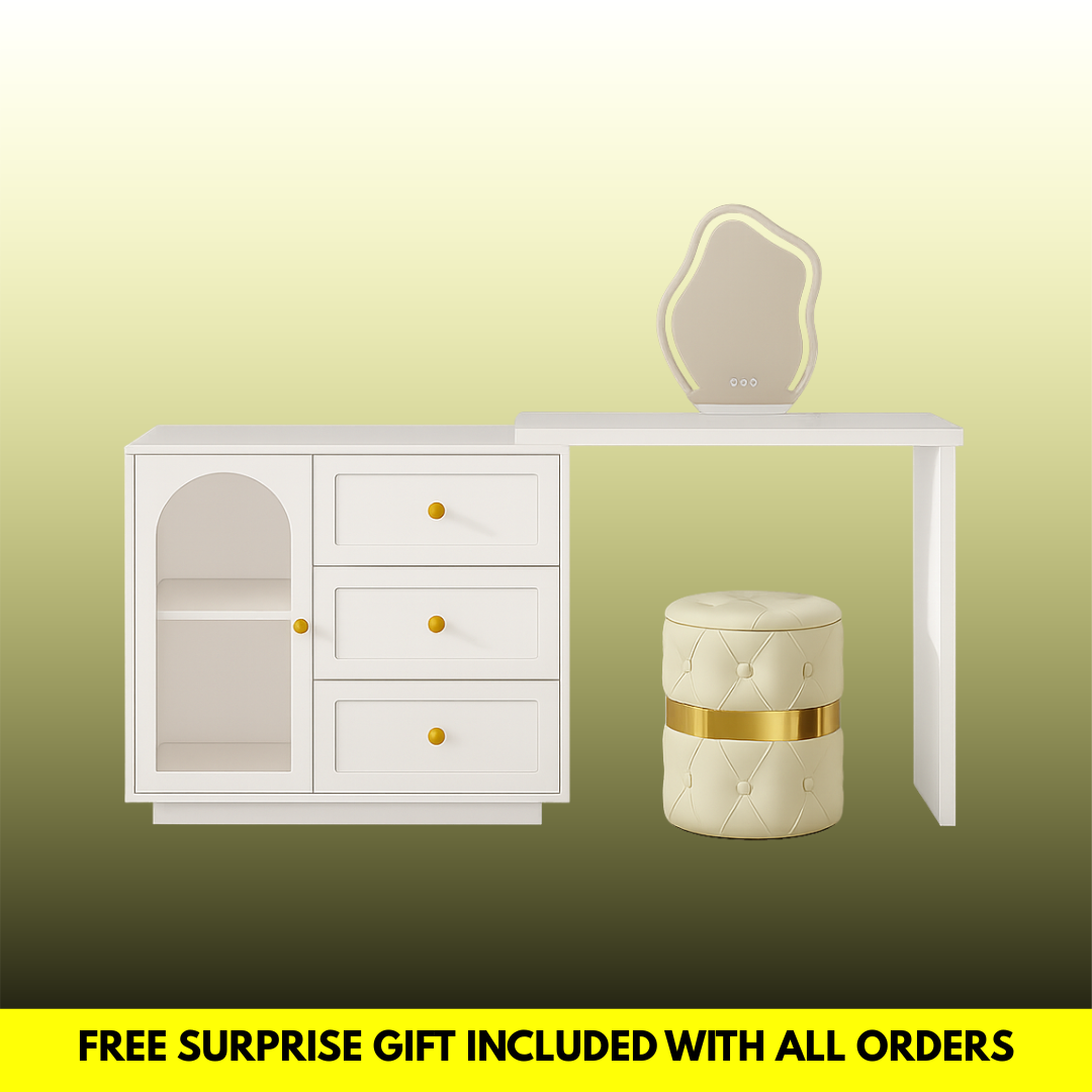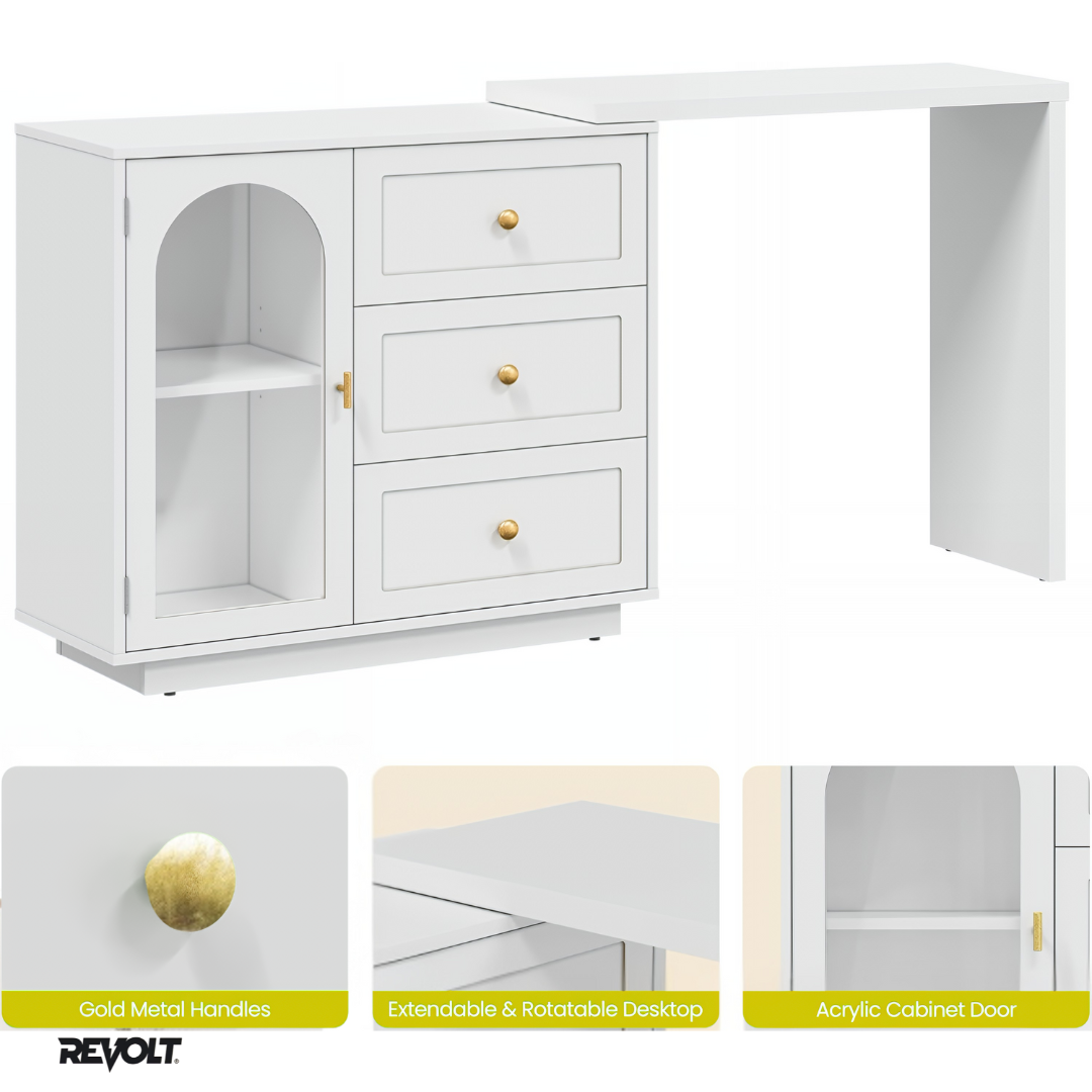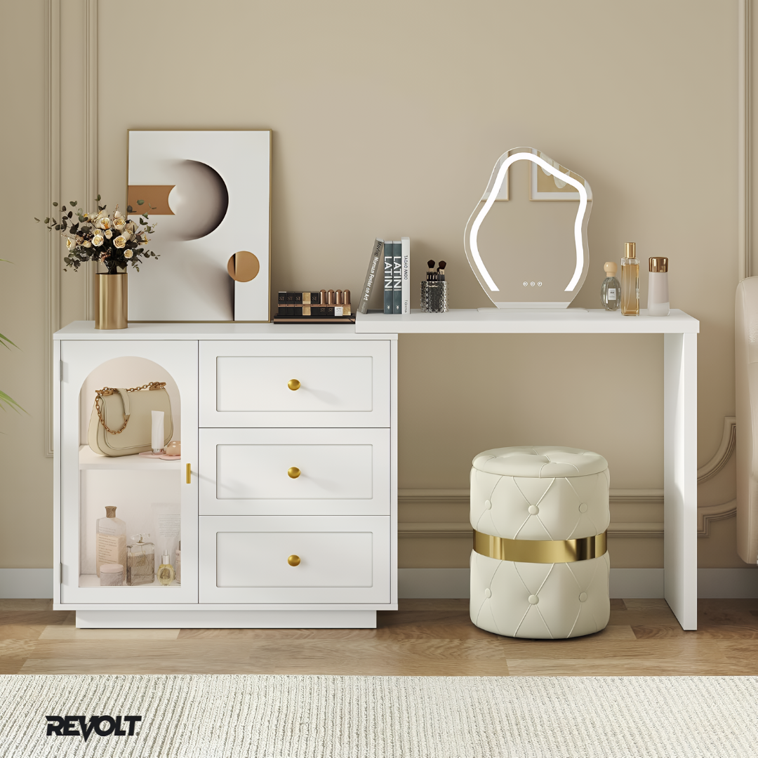 The REVOLT Opal™ blends intelligent design with timeless sophistication. Its extendable tabletop adapts to any room size, while spacious drawers keep your essentials neatly organized — combining beauty and practicality in one refined piece.